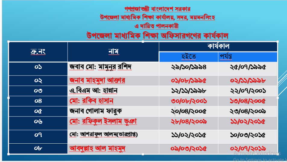 উপজেলা মাধ্যমিক শিক্ষা অফিসারগণের কার্যকাল